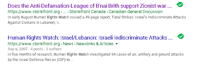 In fact, Stormfront also quotes Human Rights Watch for fuel for its anti-Israel articles. Stormfront was just taken down, but Google cache shows several of the articles: