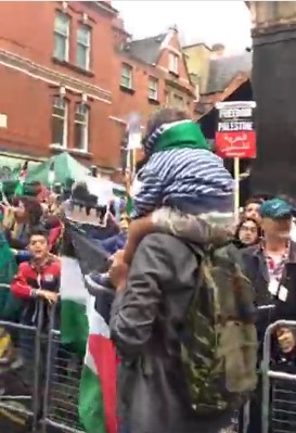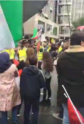 “Islamic thugs, attacking the Jews outside the Israeli embassy. Stealing and burning the flag. Israeli flag burning from about 3 minutes in. Cries of Allahu Akbar. Footage from 22/7 at Israeli Embassy. Hezbollah flag back on London streets, violent Islamic thugs. Listen to vile commentary too.”