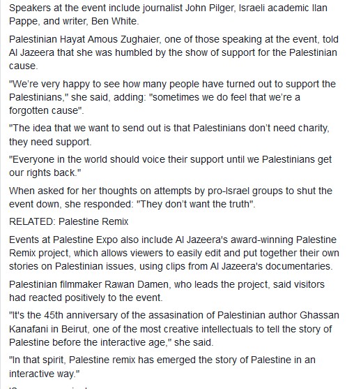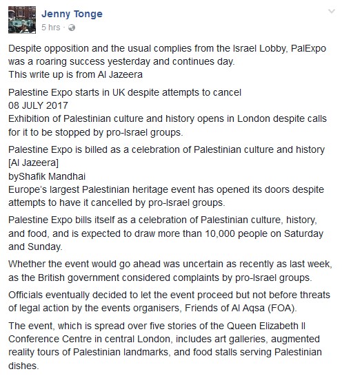 Jenny is a life peer, a member of the House of Lords. She sits on the International Board of Reference (go figure!) of the so-called “Peacemaker Mediators” organisation. Like Stephen, Jenny seldom wastes an opportunity to demonise Israel. Here’s what she’s posted to Facebook about the benign Palestine cultural event anti-Israel hate fest that’s taken place in London this weekend: