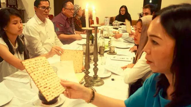 Fonny Ratumbanua holds up a piece of matzo at a Seder service in Bekasi, a suburb of Jakarta (Photo: Krithika Varagur)