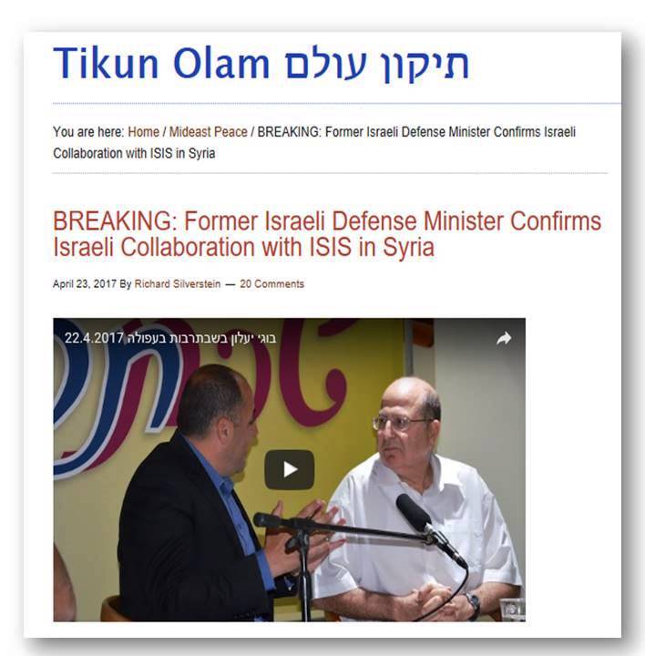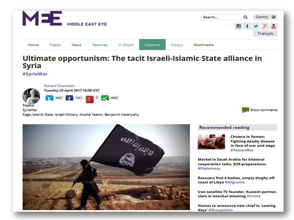As I’m writing this, I just see a new EoZ post mentioning Silverstein among those who live in a fantasy world where “Israel and ISIS are allies” – and we also learn that Silverstein is now a popular contributor to Russia Insider, where almost 10K readers thought his story about Israel’s imaginary alliance with ISIS was worth sharing… It’s just one of many Silverstein posts that could be entitled with an updated version of the Nazi slogan “The Jews are our misfortune” – as Silverstein’s message is clearly: “The Jewish state is our misfortune.” And it turns out that his message is popular: The widely shared Russia Insider post is recycledfrom the Middle East Eye, where it also got several thousand social media shares under the title “Ultimate opportunism: The tacit Israeli-Islamic State alliance in Syria,” and it was first published on Silverstein’s own blog under the title: “BREAKING: Former Israeli Defense Minister Confirms Israeli Collaboration with ISIS in Syria,” with the social media counter again showing several thousand shares.