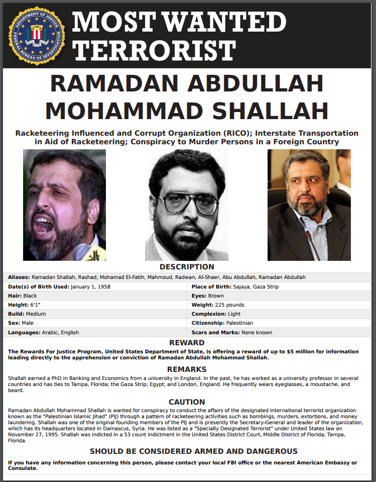 The FBI has placed Ramadan Shallah, head of Islamic Jihad, on its Most Wanted list: