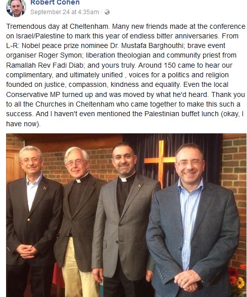 One of his allies, Robert Cohen, who’s married to an Anglican vicar (of the double X chromosome variety) and blogs against Israel at Micah’s Paradigm Shift and Pantheos, was recently in posh Cheltenham for a churchy Israel-bashing shmooze which apparently had the local Conservative MP purring: