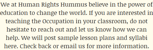 ‘We at Human Rights Hummus believe in the power of education to change the world. If you are interested in teaching the Occupation in your classroom, do not hesitate to reach out and let us know how we can help. We will post sample lesson plans and syllabi here. Check back or email us for more information.’