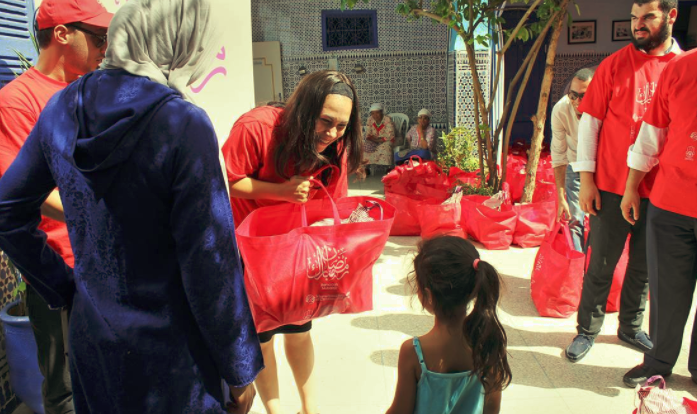 Yael Eckstein, the VP of the International Fellowship of Christians and Jews, hands a child a bag full of food for Ramadan (Yardena Schwartz/ NBC News)