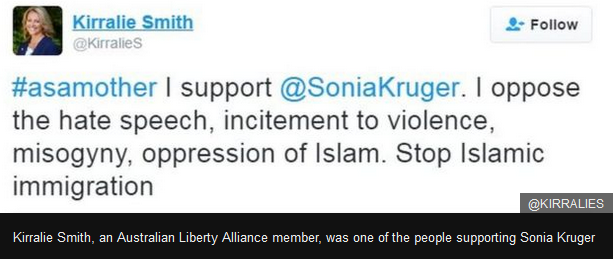 Note how the BBC has chosen to report this incident, giving emphasis to Ms Kruger’s critics and deriders of her “as a mother” remark in explaining how Islamic terror worries her. Some examples from the report: