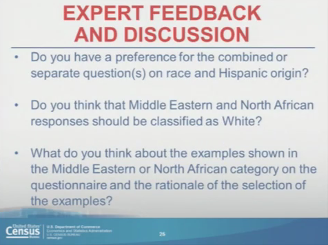 So I wanted to answer question number two, and this is more actually for what I would consider our community to really think about this. I’m having a hard time understanding where the context is coming from the perspective of our community. So as a social service provider thinking about what are we going to use this information for? Like I don’t really care about just counting how many people there are who are “MENA” it’s how we utilize this information that can be beneficial to our community. So the answer to number two for me is no because we have to understand that the way that people respond is based on the political context that we live in.
