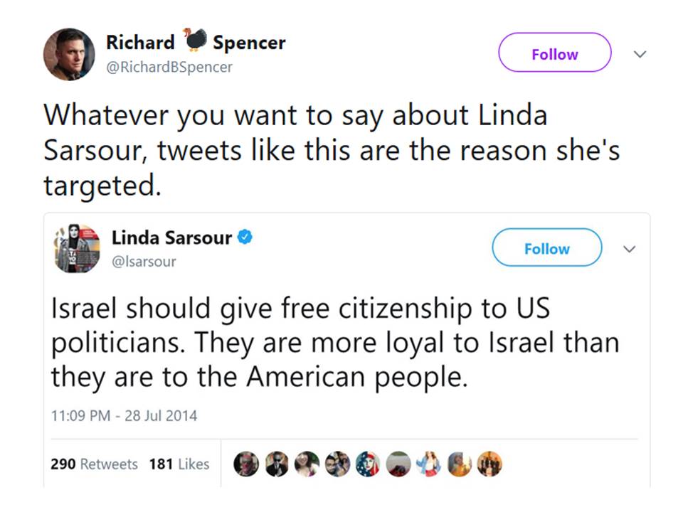 You see, the ADL isn’t just defaming Palestinians – they’re also defaming the likes of David Duke and Richard Spencer, and of course, worst of all, they’re defaming you, dear Linda Sarsour!!! But isn’t it a consolation that you are in such great company???
