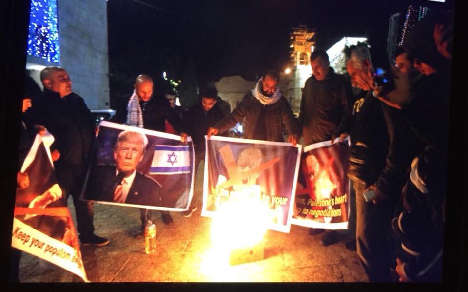 The page also approvingly shows Palestinians in Bethlehem – in Manger Square, next to the Christmas decorations – burning images of Trump.