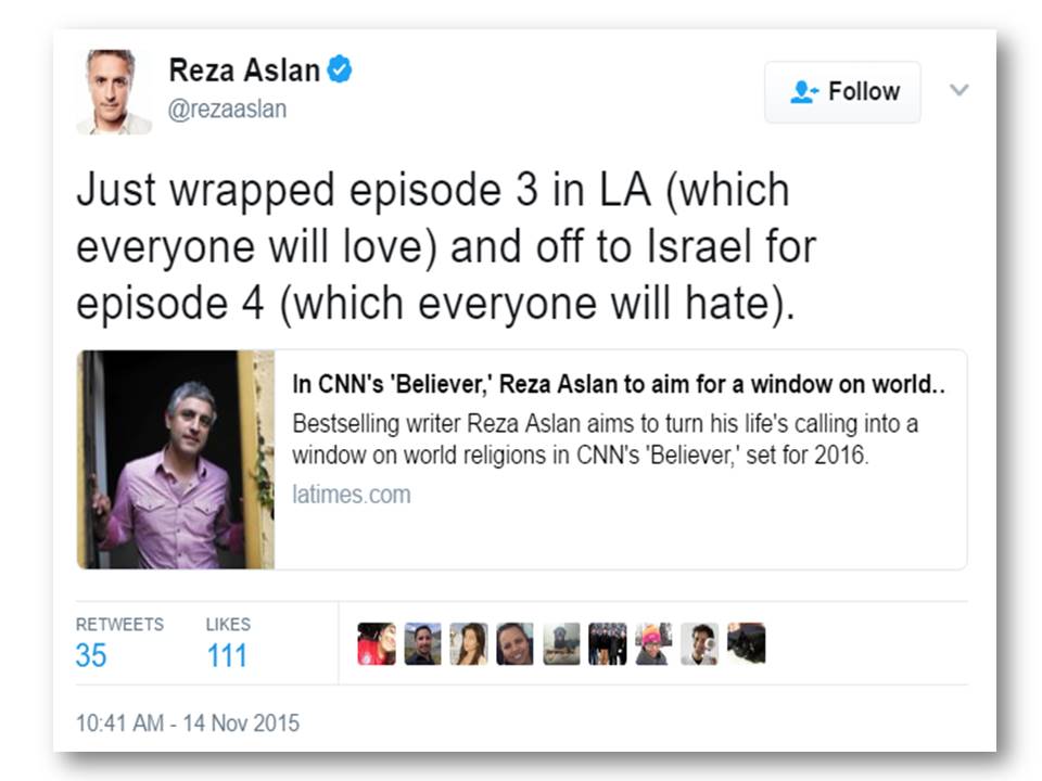 However, originally Aslan apparently didn’t think that “every episode” will “piss somebody off,” because when he was busy filming the episodes some two years ago (i.e. not long after he had warmly endorsed Blumenthal’s glorification of Hamas), he tweeted: “Just wrapped episode 3 in LA (which everyone will love) and off to Israel for episode 4 (which everyone will hate).”