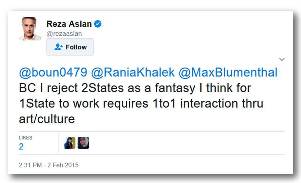 But Aslan is genuinely lying when he claims to worry about the future of Israel, because he doesn’t want Israel to have any future. As he said in a Twitter exchange with notorious Israel-haters some two years ago, he rejects a two-state solution “as a fantasy;” at the same time, he indulges the fantasy that the Arab-Muslim majority state that should replace Israel can work out swell if there’s “1to1 interaction thru art/culture.”