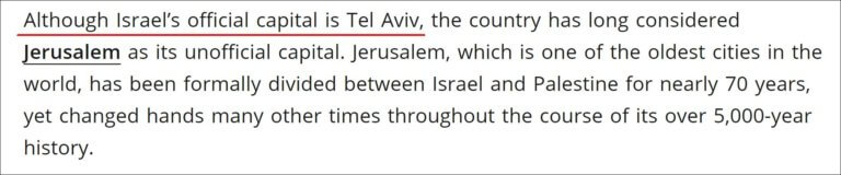 Of course, a capital would only be important to a country — a fact that puts the quote in context, while raising the question that since Jerusalem has never been the capital of a Muslim country, why do Palestinian Arabs suddenly want Jerusalem now. The article leaves out the close ties Jews in the Diaspora have had with Jerusalem and the fact they became a majority in Jerusalem towards the latter part of the 1800’s.
