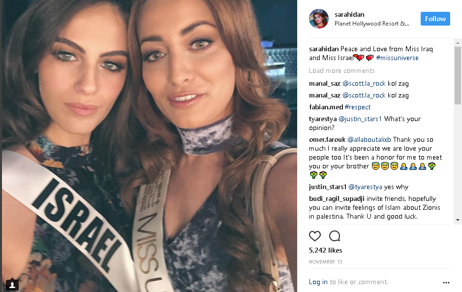 Last month, a firestorm of criticism was directed to Miss Universe Iraq Sara Idan for posting this selfie of herself on Instagram with Miss Universe Israel Adar Gandelsman: