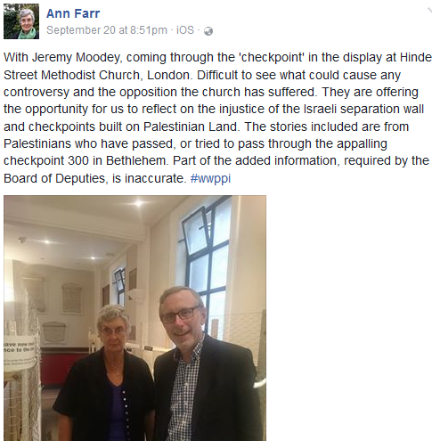 Moody posted a July 9, 2015 tweet endorsing BDS, stating: “Ten years of #BDS against Israel’s occupation of #Palestine. Major achievements for a movement that is now mainstream.”Moody sent an October 2013 letter to The Methodist Observer “explaining why Embrace the Middle East is encouraging Christians to consider BDS as a non-violent tool to end the occupation.”