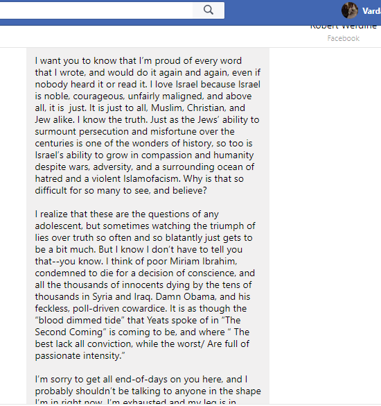 Robert was well aware of the scam of the Arab “refugees” accusing Israel of occupation. He saw straight through Linda Sarsour and termed her “dreadful.” He hated the New York Times piece, Linda Sarsour Is a Brooklyn Homegirl in a Hijab, and called it “a fluff piece masquerading as an in depth profile.”