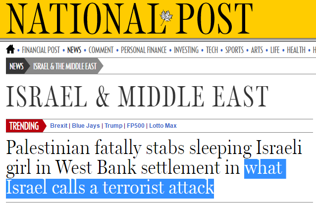 It isn’t as if the National Post is reluctant to use the word terrorist without qualification. Only two days earlier it published this headline:
