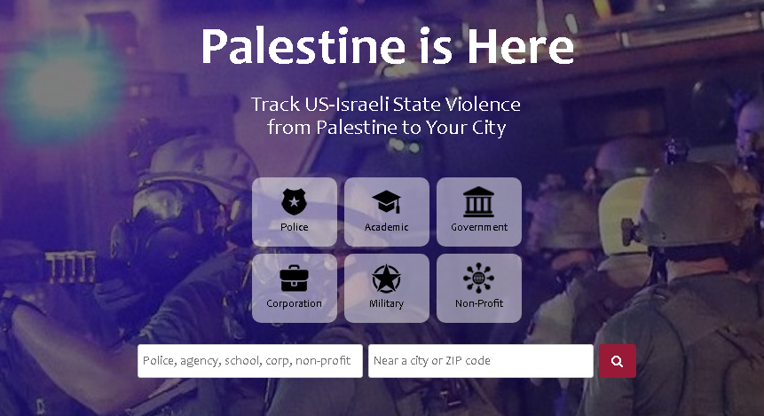 Palestine is Here, a project of Researching the American-Israeli Alliance (RAIA), is a database tracking Israeli military ties to American local government, police departments, corporations, and academic institutions. Using simple search algorithms to help activists expose the connections between American and Israeli state violence in their communities, the database works to support direct grassroots organizing to end US militarized trainings, academic collaborations, and technological exchanges with Israel.