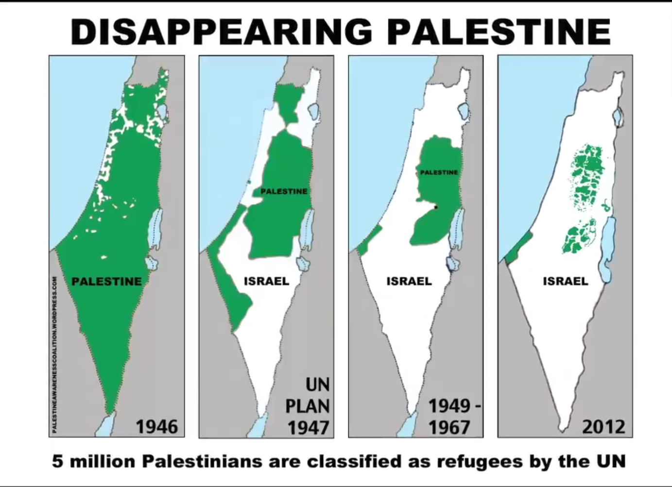 This has been debunked so thoroughly that textbooks and news networks that showed it apologized afterwards because they didn’t want to be associated with such a blatant twisting of the truth. This version is even worse than most by calling the area that the UN proposed as “The Arab State” “Palestine” as well as the areas that were under Jordanian and Egyptian control before 1967, as obvious a falsification of history as can be imagined.