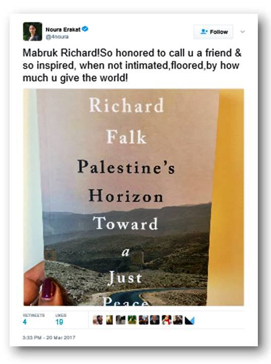 Given Erakat’s views on Odeh, it is hardly surprising that she is also an ardent admirer of Richard Falk, an antisemitic 9/11 truther whose support for the terror group Hamas has even upset the Palestinian Authority. But Professor Erakat is “honored” to call Falk “a friend” and she’s “so inspired, when not intimated, floored” by how much Falk gives the world…