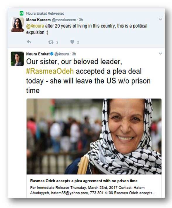 When the news broke late last week that convicted terrorist and US immigration fraudster Rasmea Odeh had decided to accept a plea bargain that requires her to leave the US while allowing her to avoid prison, no one needed to rally the “usual suspects”: anti-Israel activists at Ali Abunimah’s Electronic Intifada and the Orwellian-named Jewish Voice for Peace were quick to reaffirm their support for Odeh by eagerly amplifying the odious statement put out by the “Rasmea Defense Committee.” But these notorious fringe voices were soon joined by Noura Erakat, an assistant professor at George Mason University, “where she teaches in the legal studies, international studies, and human rights/social justice studies concentrations.” Erakat also seems to have some credibility with the US mainstream media; she has e.g. appeared on CNN and PBS and has voiced her views on terrorism in the New York Times, as EoZ highlighted in a critical post last year.