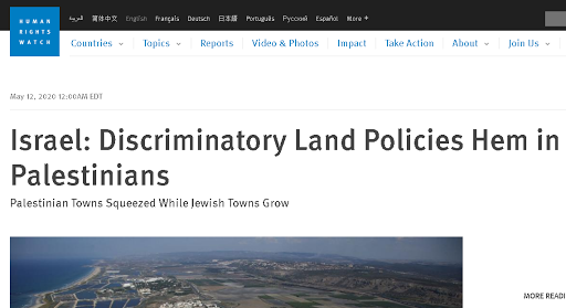 Human Rights Watch issued a new report, Israel: Discriminatory Land Policies Hem in Palestinians: Palestinian Towns Squeezed While Jewish Towns Grow.