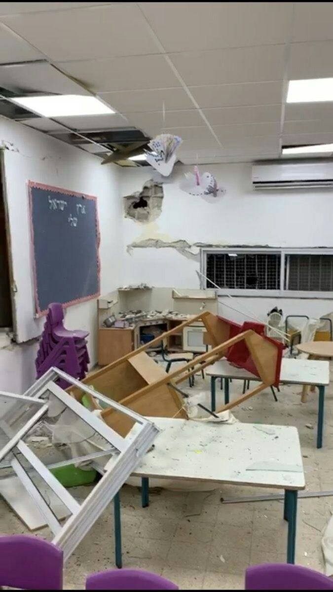 This kindergarten in Sderot suffered a direct rocket hit on Shabbat. The writing on the blackboard says: “My Eretz Israel.” |