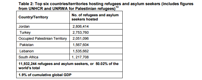 In sharp contrast, half the world’s refugees and asylum seekers – almost 12 million people – are hosted by Jordan, Turkey, the Occupied Palestinian Territory, Pakistan, Lebanon and South Africa, whose economies collectively account for less than two percent of the world’s total.