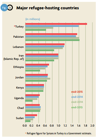 The latest UNHCR trends report, from mid-2015, already lists the top host countries of real refugees – and they are mostly still poor countries: (note how the numbers in Jordan and Lebanon compare with Oxfam’s numbers:)