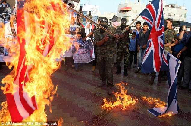 Palestinians burn British, American and Israeli flags on anniversary of Balfour Declaration in 2015 |