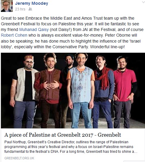 “Great to see Embrace the Middle East and Amos Trust team up with the Greenbelt Festival to focus on Palestine this year,” he tells his Facebook faithful. “Wonderful line-up!”