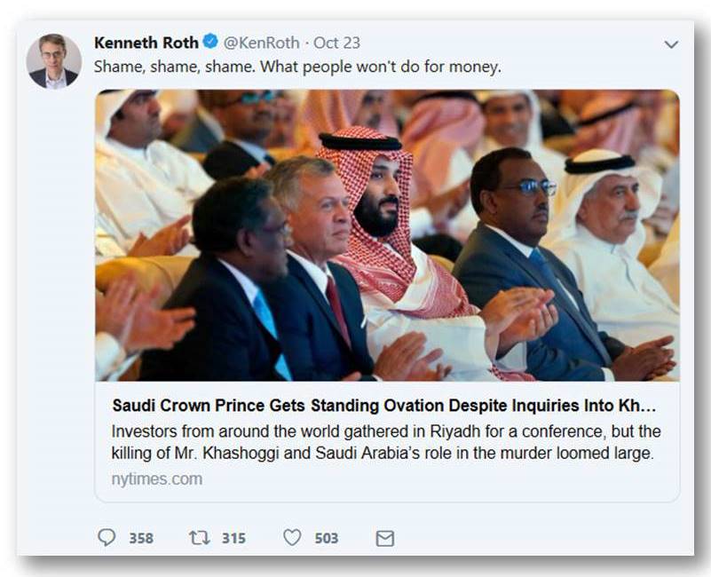 Just like Whitson has changed her tune on the Saudis, her boss Ken Roth is by now also sure that they really deserve to be shunned. As he commenteddisapprovingly on a recent report about brisk business at a Saudi investment conference: “Shame, shame, shame. What people won’t do for money.”