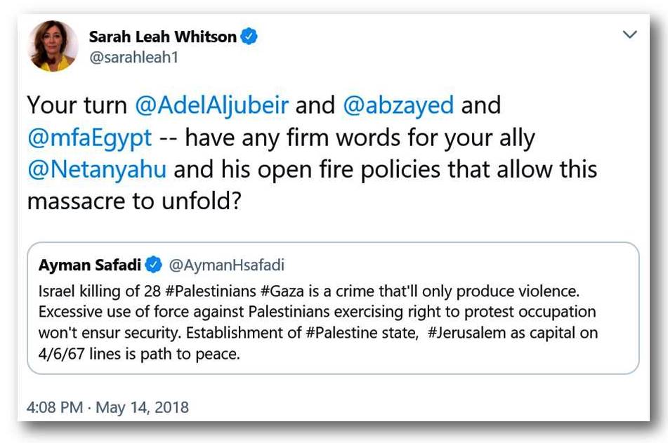 Back in the merry month of May, Whitson quoted a tweet by Jordan’s foreign minister condemning Israel’s response to the Gaza riots and added the comment: “Your turn @AdelAljubeir and @abzayed and @mfaEgypt — have any firm words for your ally @Netanyahu and his open fire policies that allow this massacre to unfold?”