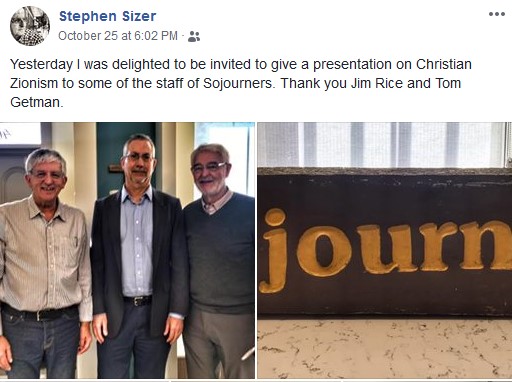 Meanwhile, in America the Sojourners organisation’s magazine staff gets a dose of anti-Israel propaganda from “apartheid state” demoniser Stephen Sizer during his recent visit stateside: