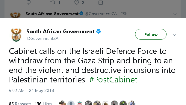 Cabinet calls on the Israeli Defence Force to withdraw from the Gaza Strip and bring to an end the violent and destructive incursions into Palestinian territories. #PostCabinet— South African Government (@GovernmentZA) May 24, 2018
