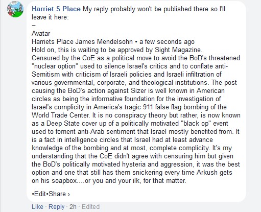 Anti-Zionist blogger Harriet, whoever he is, seems mighty tolerant of conspiracy theories. Here’s what I just found on his Facebook page, with no trouble at all: