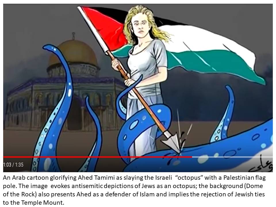Last but not least, here’s a revealing Al Mayadeen clip about how Ahed Tamimi is presented to her fans in the Arab world – and you don’t have to know Arabic, because the pictures glorifying Ahed speak for themselves, showing clearly that her Arab fans know very well that the Tamimis are not fighting Israeli settlements or the occupation of the West Bank, but Israel’s existence as a Jewish state in any borders.