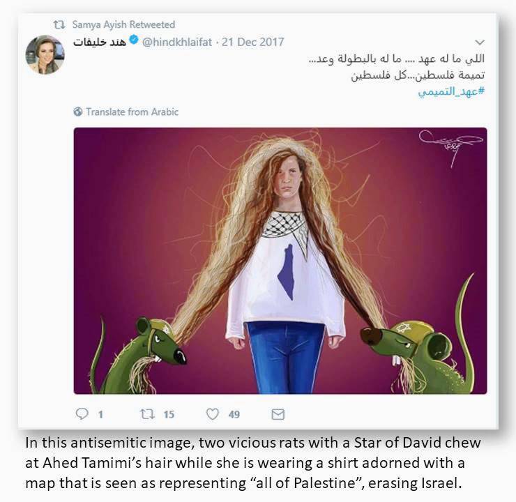 The image was apparently very popular on Facebookand Twitter; interestingly – and depressingly – it was also retweeted by Samya Ayish, who describes herself as a Palestinian “Journalist/ Producer in @CNNArabic.” Perhaps Ayish didn’t notice the antisemitic imagery of the two rats with the Star of David, but she surely didn’t have a problem reading the Arabic text of the tweetwhich praised Ahed for wearing (or representing) “the amulet of Palestine … all of Palestine.” So it seems that at least at CNN Arabic, they know what the Tamimis stand for.