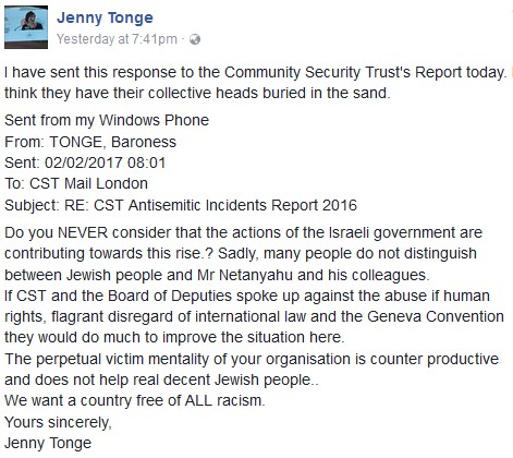 It so happens that Her Ladyship like others on its mailing list has received a communication from the Community Security Trust (CST) informing her of its new report on antisemitic incidents in the UK last year.