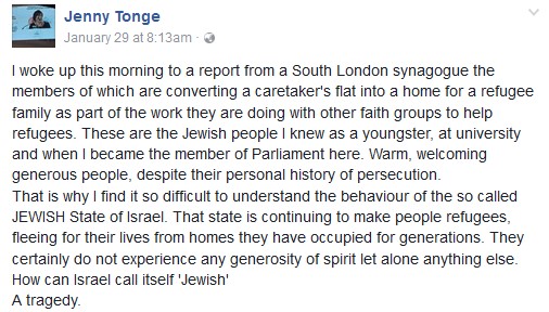 In the screenshot at left she’s using a recently reported humanitarian initiative by the South London Liberal Synagogue as a stick with which to beat those Israelis who have the temerity to defend their little state against terrorism, Arab rejectionism, and aggression.