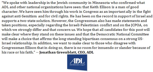 UPDATE: Some have pointed out that this is not an endorsement. The context is Greenblatt’s tweet, where he writes “Many asked us about Rep. Ellison. Here’s our thoughts:” To me, this is a response to “What do you think about Ellison as the DNC chair?” since that is what people are asking. The response is “he’s a man of good character.” Yes, it isn’t an endorsement, but by whitewashing Ellison’s record and saying that he is a great guy, the ADL is saying that they are fine with him in that position.