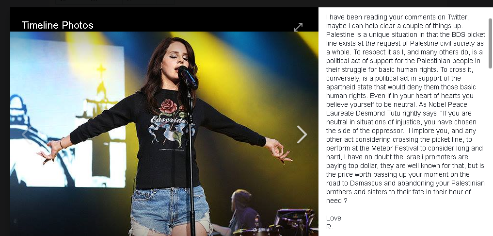 I have been reading your comments on Twitter, maybe I can help clear a couple of things up. Palestine is a unique situation in that the BDS picket line exists at the request of Palestine civil society as a whole. To respect it as I, and many others do, is a political act of support for the Palestinian people in their struggle for basic human rights. To cross it, conversely, is a political act in support of the apartheid state that would deny them those basic human rights. Even if in your heart of hearts you believe yourself to be neutral. As Nobel Peace Laureate Desmond Tutu rightly says, “If you are neutral in situations of injustice, you have chosen the side of the oppressor.” I implore you, and any other act considering crossing the picket line, to perform at the Meteor Festival to consider long and hard, I have no doubt the Israeli promoters are paying top dollar, they are well known for that, but is the price worth passing up your moment on the road to Damascus and abandoning your Palestinian brothers and sisters to their fate in their hour of need ?