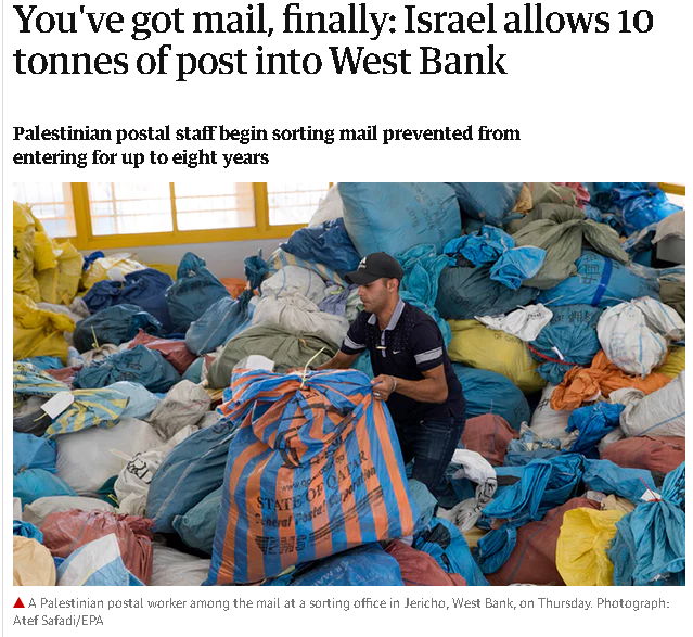 The PA confirms the above. Hussein Sawafta, director of the Palestinian postal service, told Haaretz that “Israel held up the mail because it was not properly addressed to the Israeli postal service”.