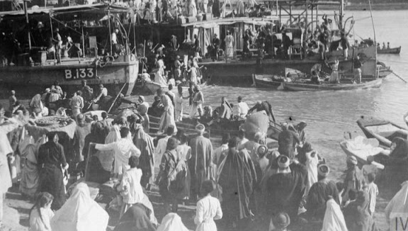 These photos, published at a Picture-a-Day, are from the Imperial War Museum’s collection.The top one shows Jews and Christians disembarking from steamers as they return to their homes in Kut in 1917. The middle photo shows Jews and Muslims being taught to sew at a military base. The bottom photo was taken in Baghdad: It shows a group of Jewish women. The fully-veiled one on the left is betrothed.