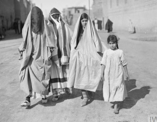 How come the women in these pictures can be identified as Jews? Because they wear coloured or white veils, in contrast to the black abayas worn by Muslim women.