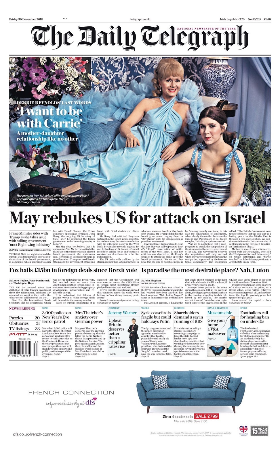 “We do not… believe that the way to negotiate peace is by focusing on only one issue, in this case the construction of settlements, when clearly the conflict between the Israelis and Palestinians is so deeply complex,” Mrs May’s spokesman said.