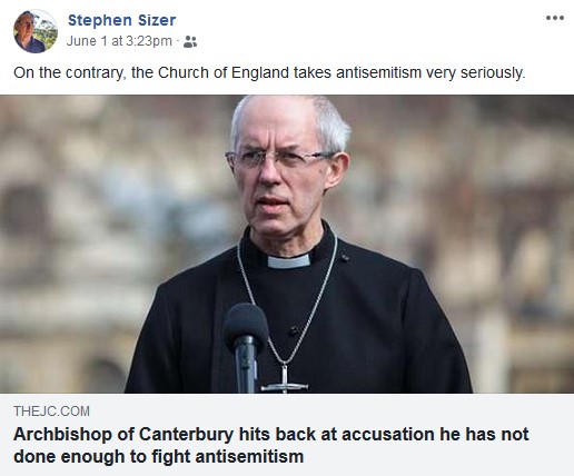 To judge by what he allows commenters on his own page to get away with (I’ve given many examples over the years), it would seem that “the Church of England takes antisemitism very seriously” does not represent him, or the followers in question would surely long since have been defriended.)