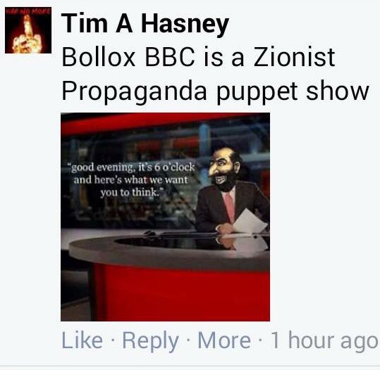 A message was shared from the online Labour Party Forum, showing a man with a large nose reading the BBC Six O’Clock News alongside the caption: ‘B***** BBC is Zionist propaganda puppet show.’
