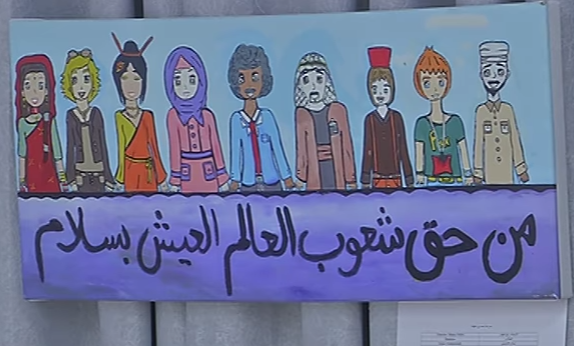 Even when the kids pretend to show their desire for peace among all peoples in the world, they pointedly ignore the one people who are indigenous to the region: