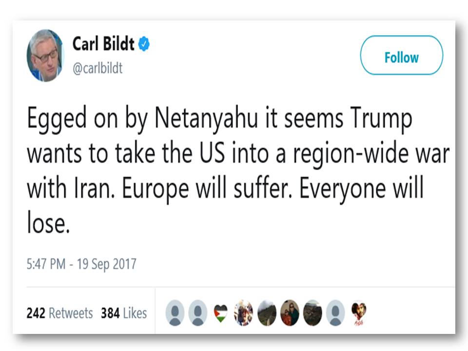Last but not least, it’s also worthwhile pondering Omri Ceren’s view that Plame Wilson simply said “what many advocates of Obama’s realignment with Iran believe” and that her original tweet linking to the article from Unz’s website was therefore just “an increasingly routine attack on Jews mainstreamed by Obama admin & its echo chamber to sell the Iran deal.” Omri’s thread includes many relevant examples; one could arguably add a recent tweet from the influential Swedish politician and former EU and UN official Carl Bildt, who told his 650K Twitter followers: “Egged on by Netanyahu it seems Trump wants to take the US into a region-wide war with Iran. Europe will suffer. Everyone will lose.”
