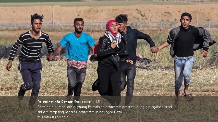 Forming a human shield, young Palestinian protesters protect young girl against Israeli snipers targeting peaceful protesters in besieged Gaza.